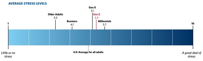 On a scale from 1 to 10 with 10 being “a great deal of stress” and 1 being “little or no stress”, Millennials and Gen Z ranked the highest, according to the American Psychological Association’s 12th annual Stress in America survey conducted in August 2018. The average score for all adults ranked at 4.9. Gen Z ranked an average of 5.3 and Millennials overtook Gen Z with an average of 5.7.