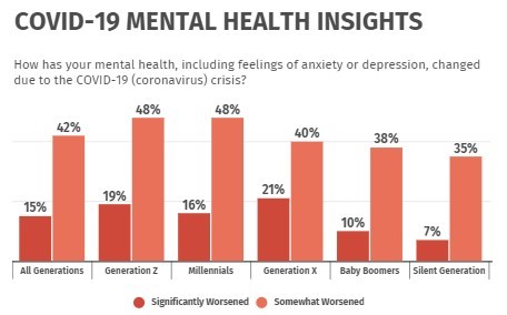48% of Millennials say their mental health has somewhat worsened as a direct result of the coronavirus pandemic, according to a study conducted by NRC Health. 16% reported their mental health significantly worsened.